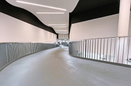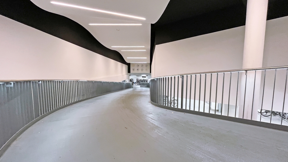- Gebaut wurde eine helle, breite Zufahrtsrampe auf das Parkdeck mit einer beleuchteten Wellendecke. Für die Rampe wurden 125 Tonnen Beton aus dem Bestandsgebäude entfernt.