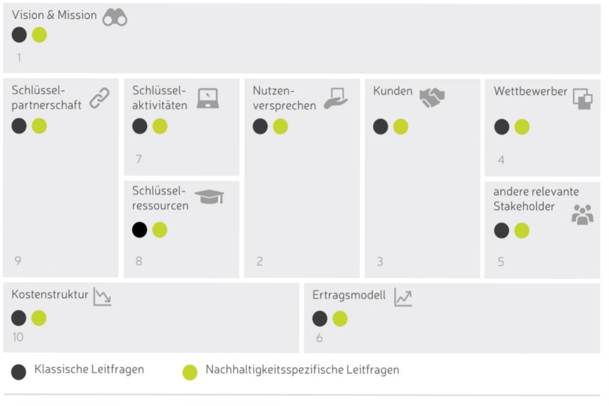 Das Projektteam integrierte eine große Bandbreite von nachhaltigkeitsspezifischen Leitfragen für diese neuen und die bereits bestehenden Elemente des BMC und schuf so die gewünschte grüne Gründungsmethode. Beispielsweise lautet eine der vielen Fragen des neuen Sustainable Business Canvas (SBC): „Hat Ihr Angebot positive oder negative Wirkungen auf Umwelt und/oder Gesellschaft? Welche?“