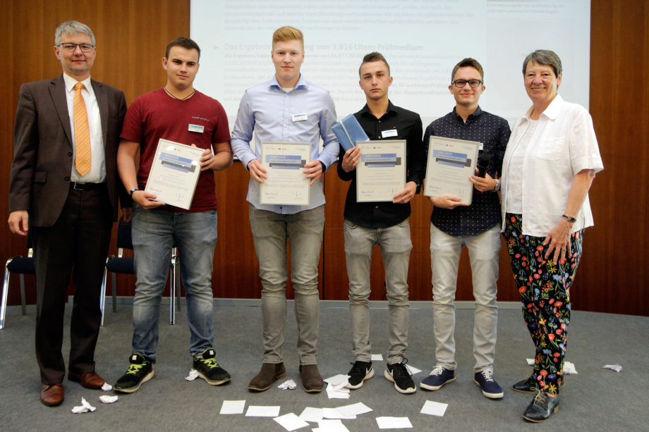 Das Team der ARI Armaturen Albert Richter GmbH & Co. KG aus Schloß Holte-Stukenbrock Lukas Fockel, Dominik Hörster, Marcel Neugebauer und Thiemo Werner erhält den Sonderpreis Ressourceneffizienz für ihr Projekt, bei dem sie herausgefunden haben, wie sie Prüfstände in der Produktion von Verunreinigungen befreien und damit das Aufkommen an Sondermüll reduzieren können. Durch ihre Konstruktion verringert sich der Einsatz des Prüfmediums, das als Sondermüll entsorgt werden muss, um 3.800 Liter pro Prüfstand.